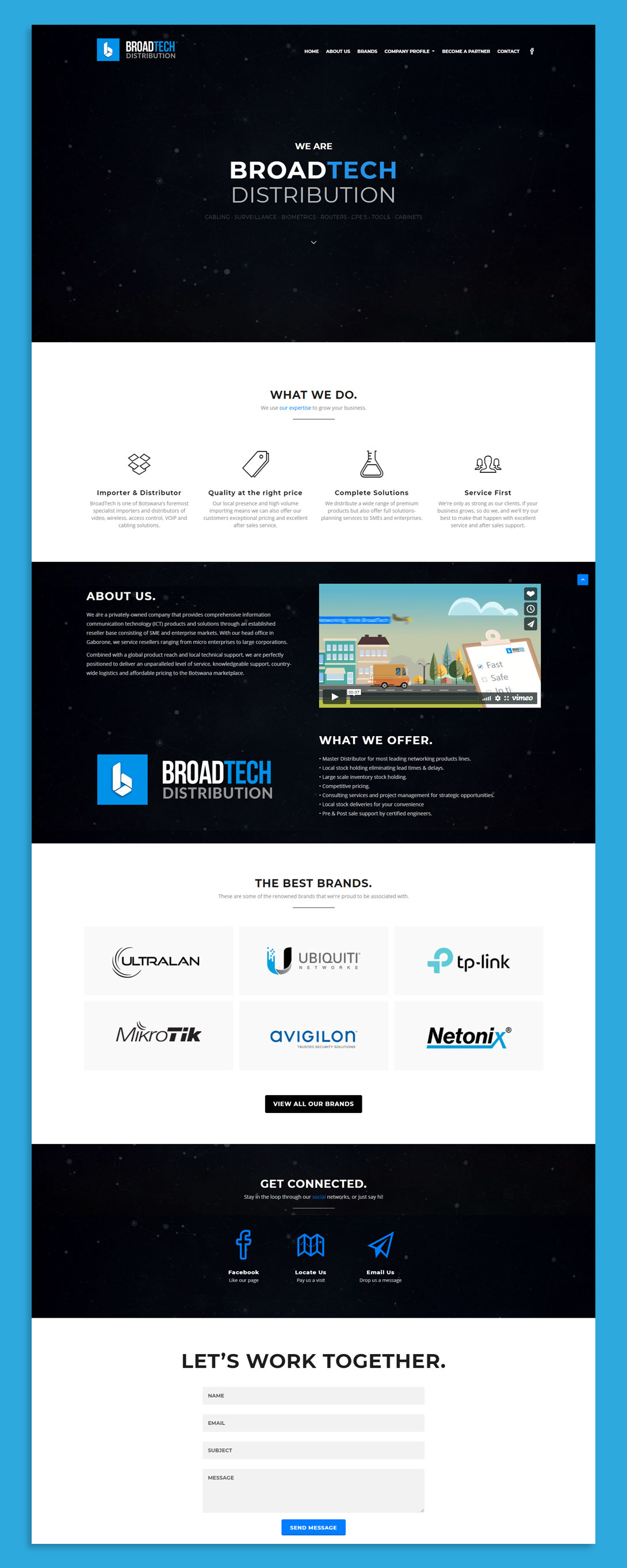 Designed for Broadtech Distribution, based in Botswana. Built from the ground up with HTML5 & CSS3, the website features parallax headers, smooth scrolling, and modern typography.