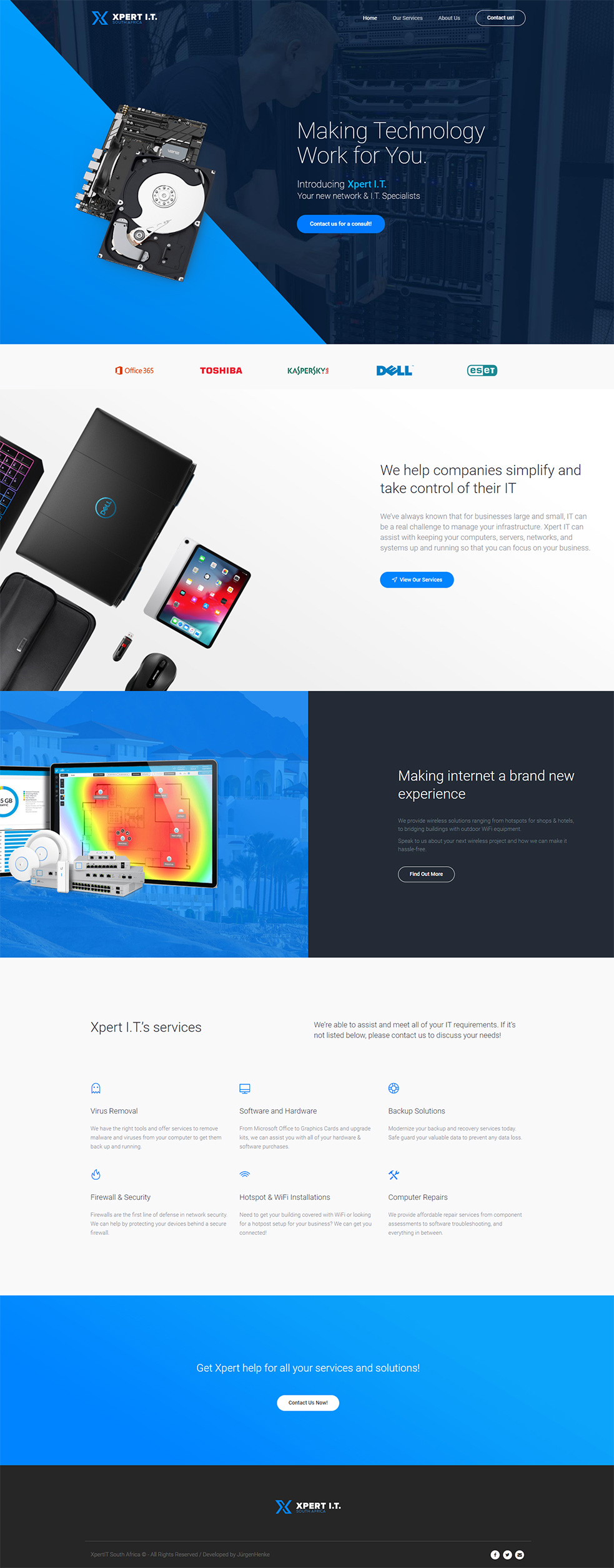 Xpert I.T. is a new startup company, and had little material to provide for the development of their website. Deciding to keep things simple, the Xpert I.T. website was designed with WordPress, and reflects a clean and modern aethestic.